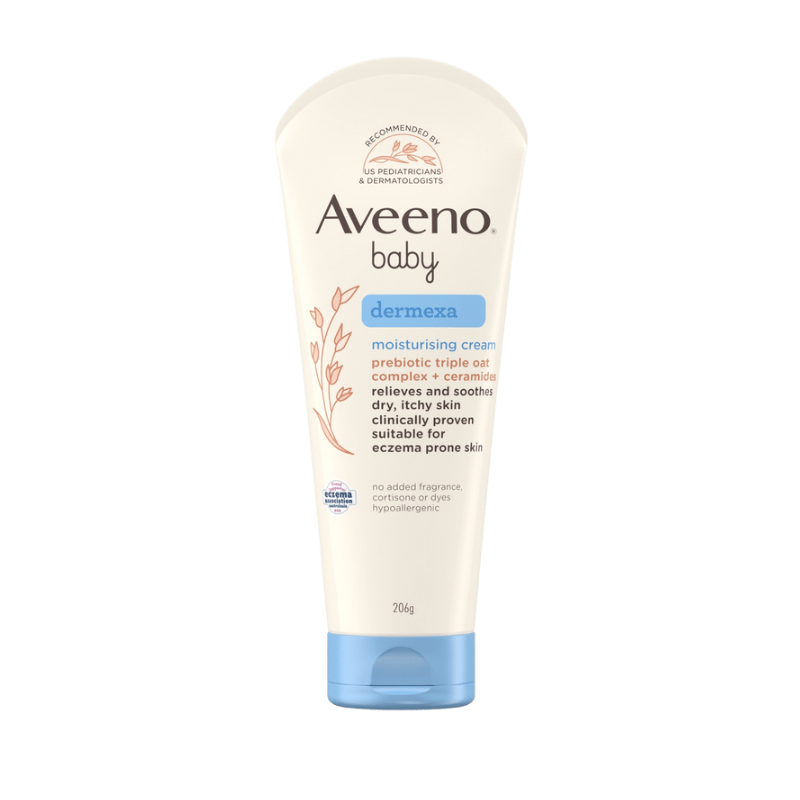 Aveeno Baby Dermexa Moisturizing Cream soothes extra dry, irritated skin. Hydrating formula moisturizes for 24 hours and is clinically proven for babies' eczema prone skin. It is formulated with naturally active Triple Oat Complex to soothe and hydrate skin.