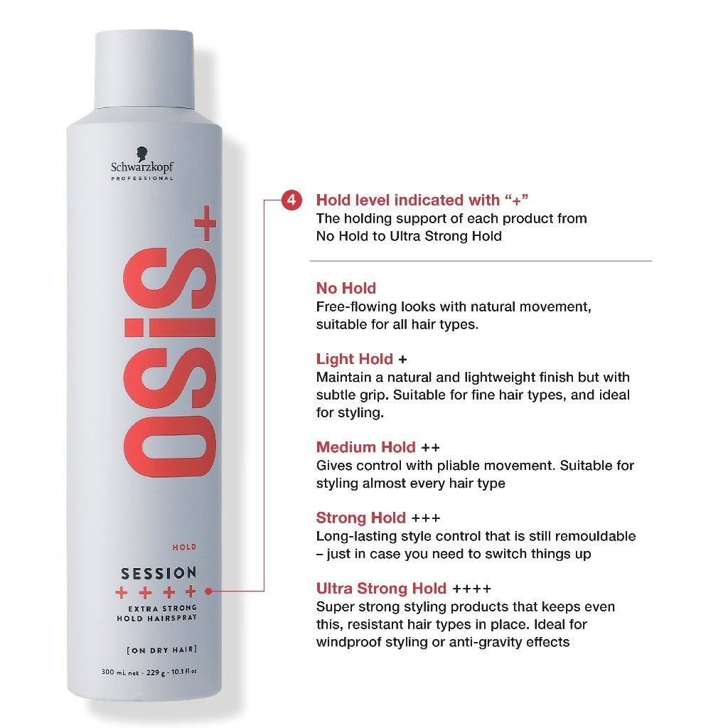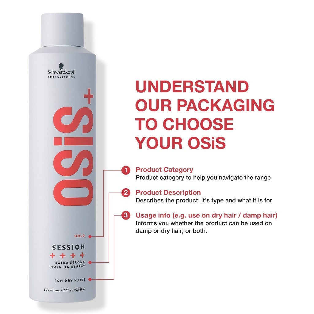 Schwarzkopf Osis+ Hairspray provides long-lasting control wlith fast-drying and easy-to-brush-out benefits. With different hold strength, find what suits your hair the best. The outstanding formula, with a film-forming resin, gives an instant stronghold to the hair and works as a humidity blocker whilst protecting against UV rays.