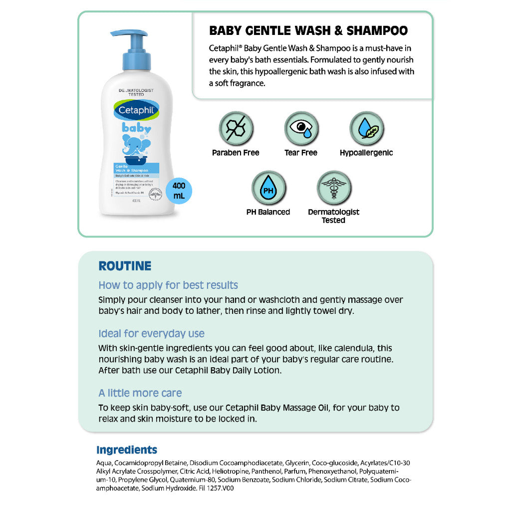 Cetaphil® Baby Gentle Wash & Shampoo is a must-have in every baby's bath essentials. Formulated to gently nourish the skin, this hypoallergenic bath wash is also infused with a soft fragrance.