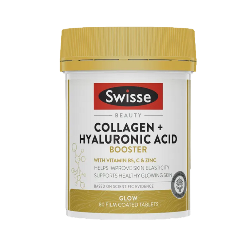 SWISSE Beauty Collagen + HA Booster - 80 TABLETS Supports skin with enough water, shiny and healthy shine from the inside with Swisse Beauty Collagen + Hyaluronic Acid Booster. Swisse Beauty product has a HA formula - Hyaluronic Acid aimed at improving elasticity and supporting collagen production.