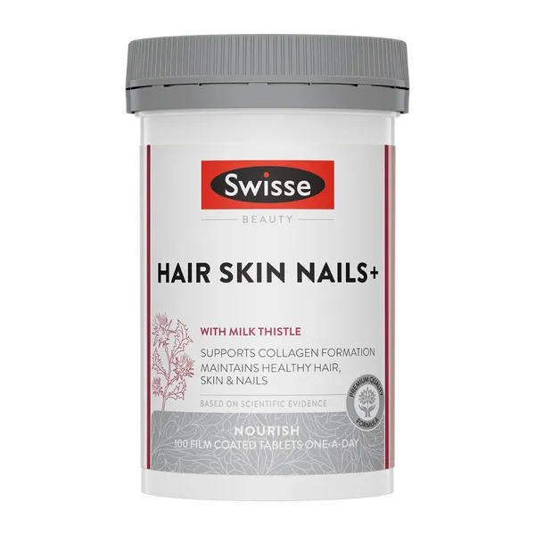 Support healthy hair, radiant skin and strong nails with Swisse Beauty Hair Skin Nails+. This premium quality formula is enriched with vitamin C, biotin, silica, and zinc. Helps to support collagen production, nail strength and hair health.