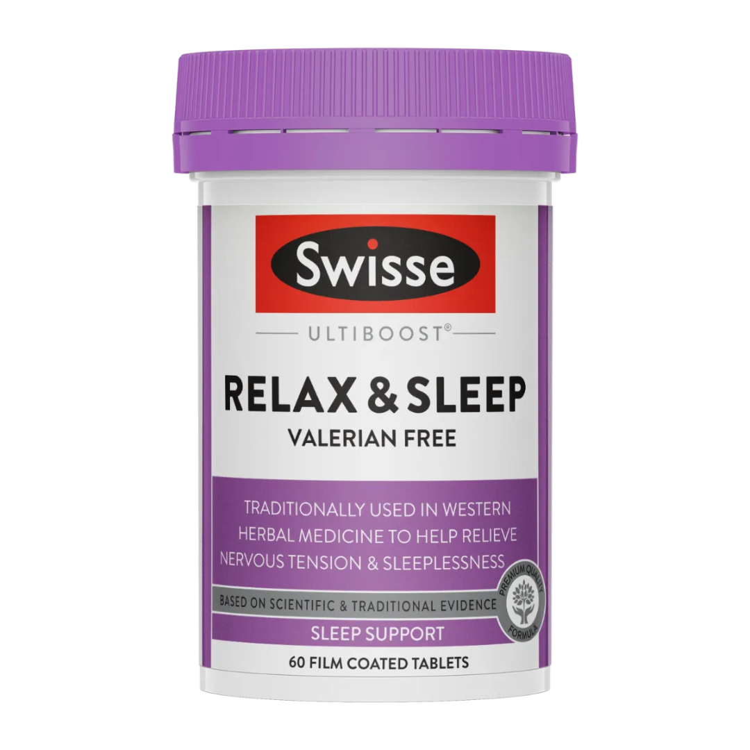 Swisse Ultiboost Relax & Sleep contains hops, passionflower, and lemon balm, traditionally used in Western herbal medicine to help relieve nervous tension, reduce sleeplessness, and assist with a natural, restful sleep.