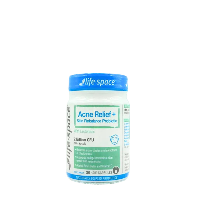 A premium, targeted probiotic formula containing 2 strains of beneficial bacteria plus Lactoferrin, Zinc, Vitamins E & C and Biotin. Relieves acne, pimples and symptoms of blackheads and supports collagen formation and skin repair and regeneration.