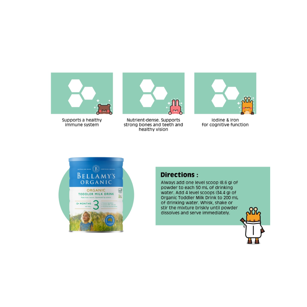 Bellamy’s Organic Step 3 Toddler Milk Drink is a premium nutrient dense milk drink, carefully crafted to support active toddlers from 1 to 3 years of age, when dietary intake may be inadequate. An enriched alternative to ordinary cow’s milk, our Toddler Milk Drink is made from certified organic full cream cows milk and is fortified with essential vitamins and minerals to support the needs of your growing toddler.