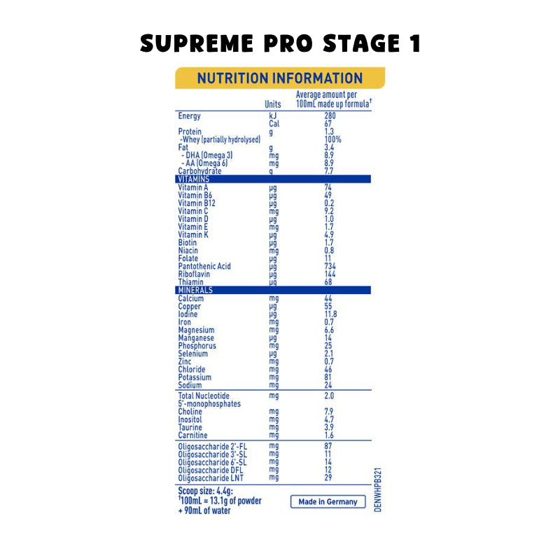 NAN SUPREME Pro 1 is a premium starter infant formula that is nutritionally complete for healthy infants from birth. Infants over 6 months of age will need additional nourishment.