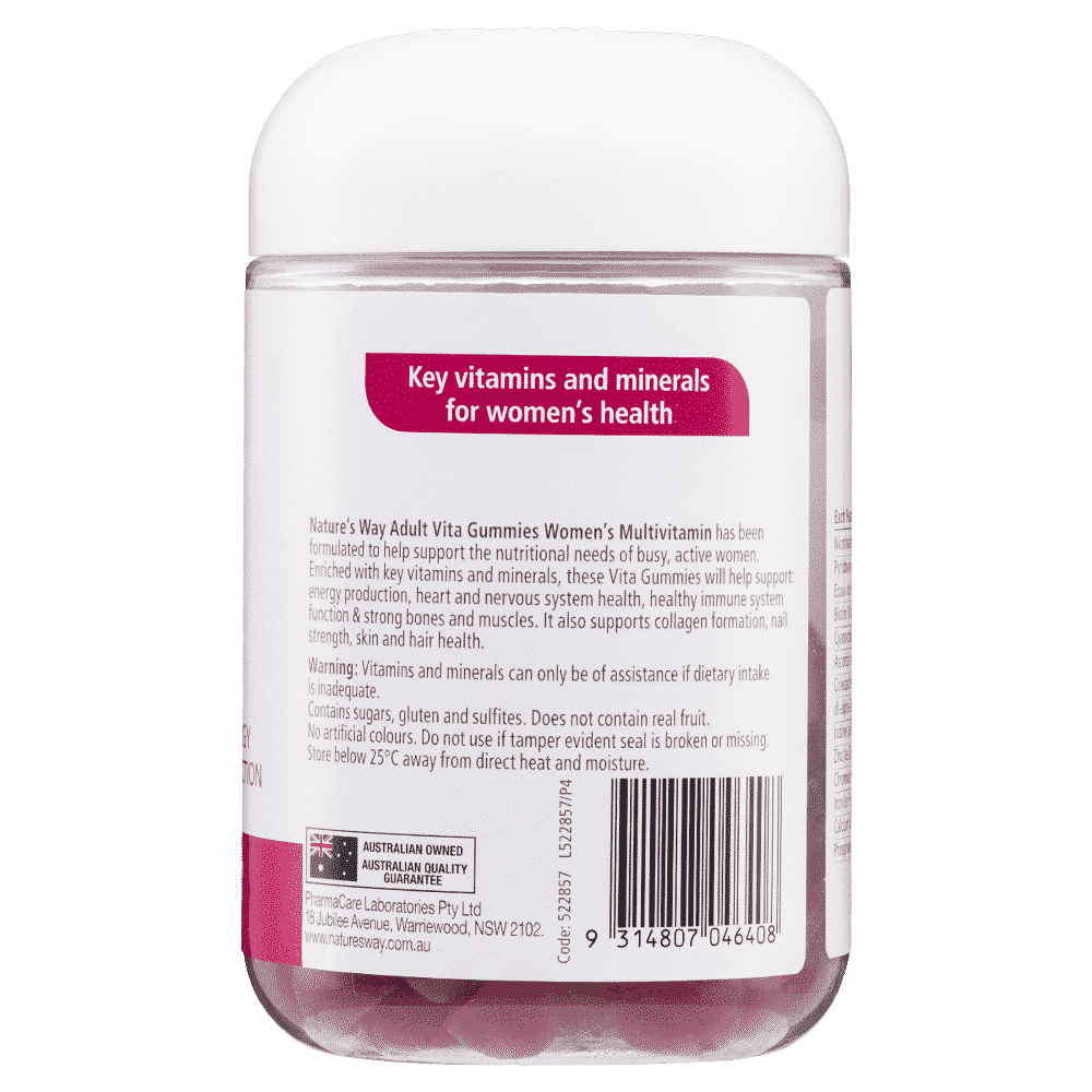 Natures Way Vita Gummies Women's multivitamins are specially formulated to support women's health. Each gummy is rich in vitamins and minerals to help support everyday health such as boosting energy levels, improving the immune system, and supporting bone, muscle, and skin health.
