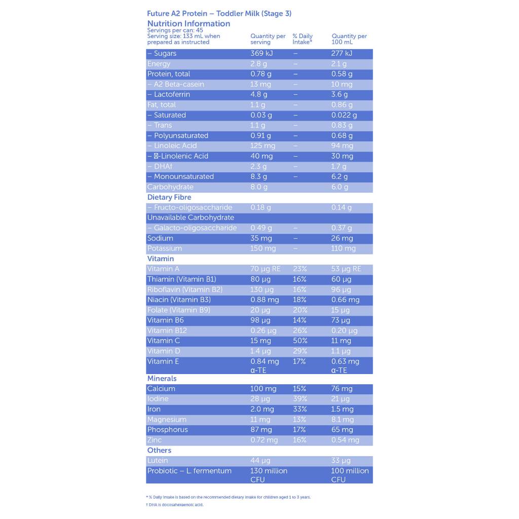 Our Stage 3 Future A2 Protein Toddler Milk Drink is made with fresh milk sourced from our Victorian farms.Made with natural A2 protein, it supports digestion and provides essential nutrients as your little one grows, explores, and thrives during toddlerhood.