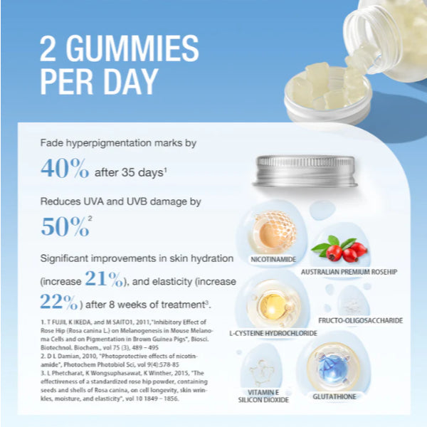 Nicotinamide Gummy or skin glow gummies is a multi-nutrient formula containing a high concentration of premium Rosehip Extract and a variety of Vitamins, including Nicotinamide, Vitamin C and E. These niacin gummies are crucial Vitamins to maintain collagen synthesis, prevent UVA and UVB damage, and promote skin repair. The naturally high Vitamin C content can help improve skin tone and texture, reduce pigmentation and give a radiant and glowing look.